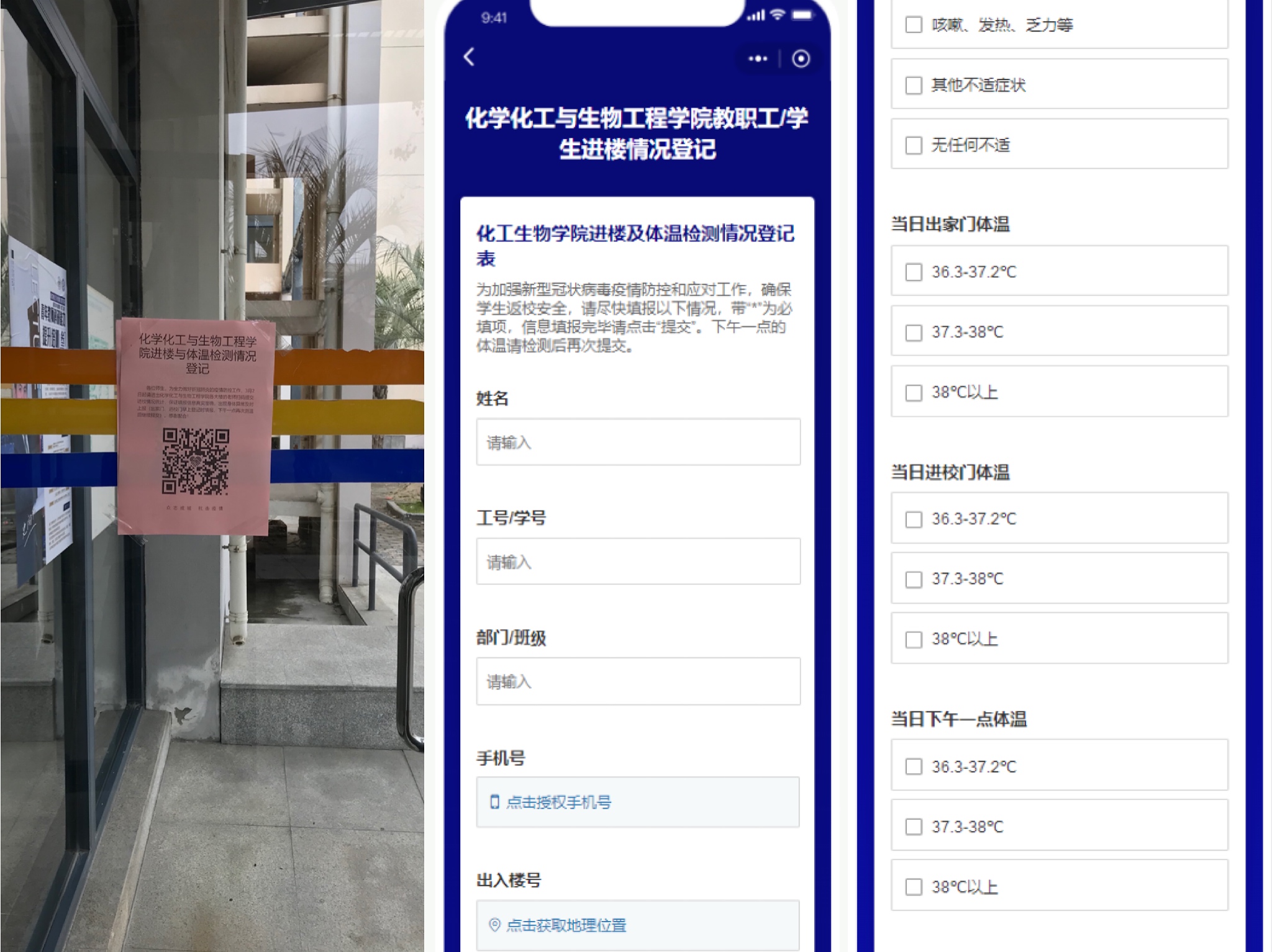 一、严格执行大楼出入登记和体温监测制度。在三号学院楼、生物楼及化学实验楼各大楼门口,贴了在线扫码登记的二维码,所有师生出入大楼均扫一次二维码登记,错峰出入,出家门、进校门、午后一点三次测体温,通过支部书记实施监控上报,一切都有条不紊地进行着。