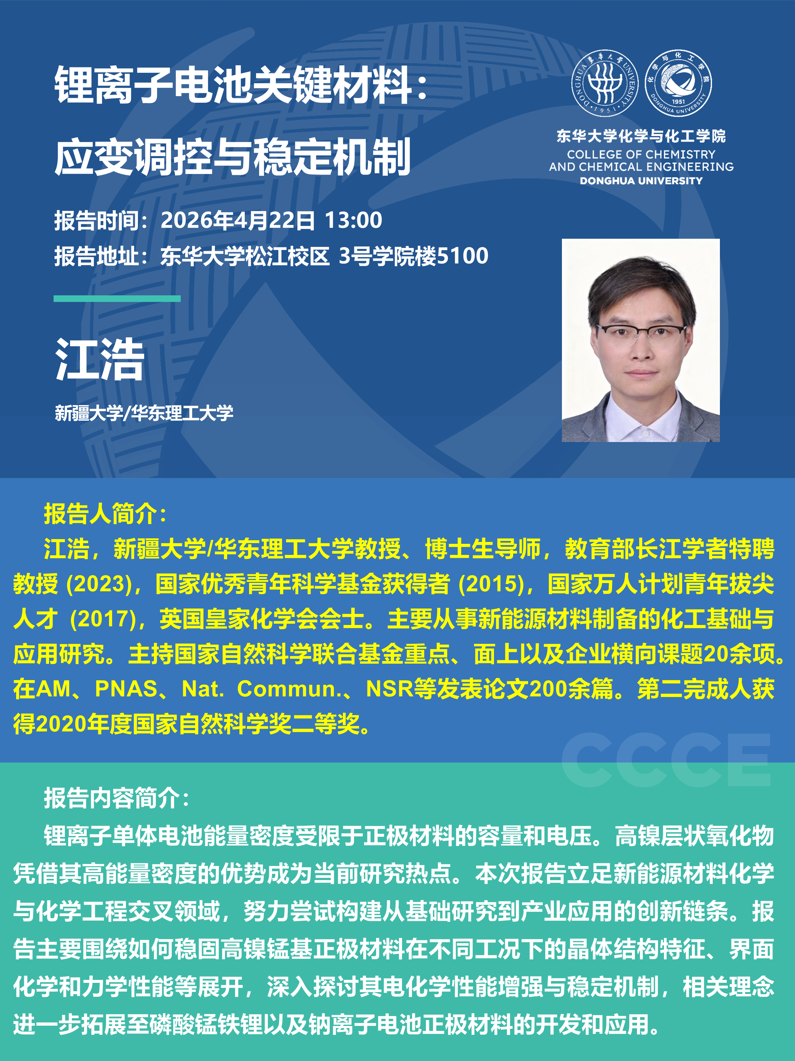 【学术讲座】锂离子电池关键材料:应变调控与稳定机制——新疆大学/华东理工大学 江浩(4月22日13:00)